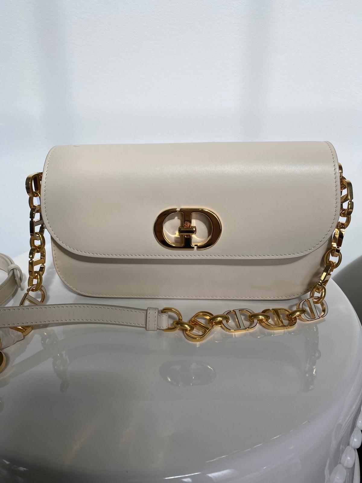 Christian Dior Cream 30 Montaigne Avenue Bag. The 30 Montaigne Avenue bag enhances the hallmark line with a timeless and elegant style. Crafted in box calfskin, the rounded flap with delicate curves is punctuated by an antique gold-finish metal CD clasp inspired by the seal of a Christian Dior perfume bottle. The design is completed by other details, like the 30 Montaigne signature embossed on the back and the signature chain alternating gold-finish metal and tonal enamel links that match the leather. The gusseted bag features a spacious and refined silhouette that can be carried by hand, worn over the shoulder or crossbody.