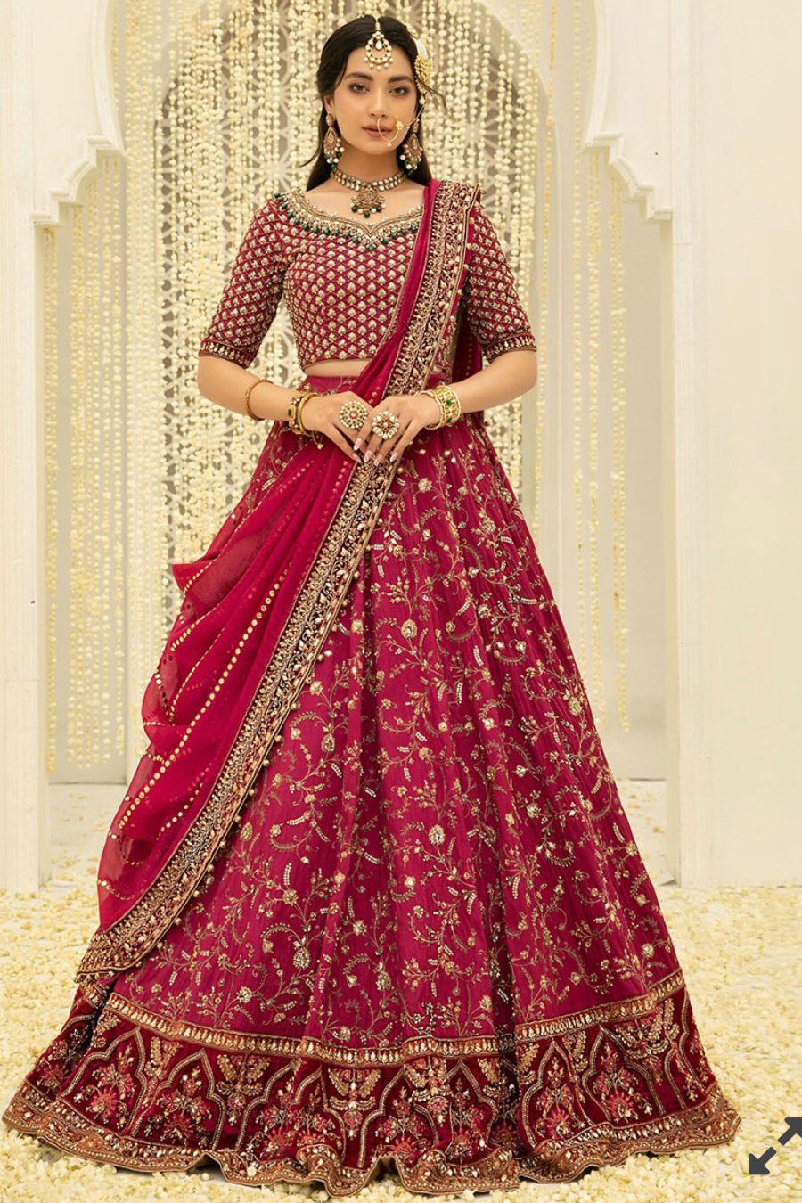 This riveting Lehnga Choli showcases an alluring neckline and emerald stones, paired with raw silk lehnga supporting extensive hand embellished double velvet borders. Dupatta is enriched with Mukesh work with hand embellished head border and three sides embroidered borders.