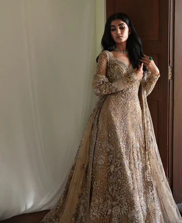 'Dazzle in reine’s golden splendor with its paneled frock, where Persian garden-inspired motifs bloom across silk with double-colored foil print. The sweetheart neckline opens to a canvas of exquisite hand-embellishments, zardosi, mukaish, crystals, and pearls, telling tales of opulence. The hem border radiates with silver handwork creepers and precise laser detailing, while the sequined four-sided dupatta captures light with every movement, framed by silver lace and delicate pearl handwork.