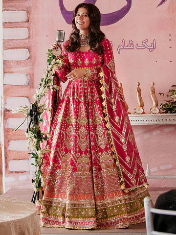 Musarrat Nazir is rich rose pink peshwas ensemble that redefines feminine grace. The ensemble is generously embroidered is generously embroidered all along the bodice and the skirt.